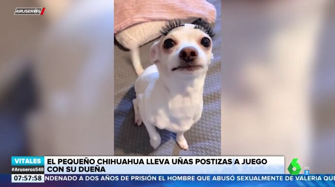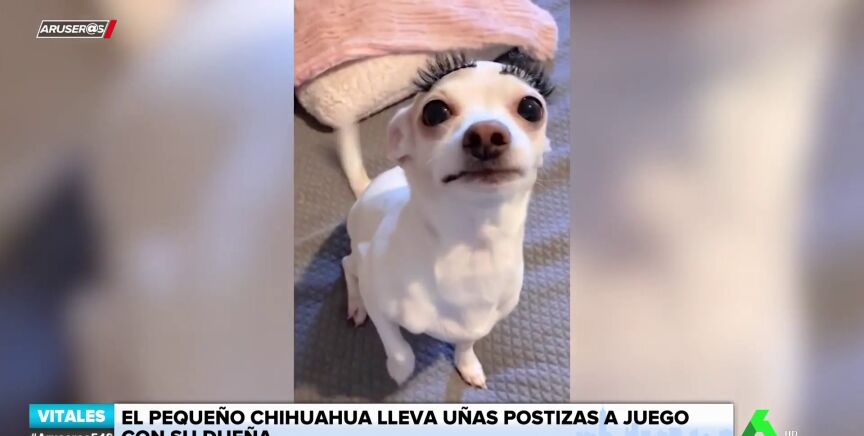 La dueña de este chihuahua parece estar obsesionada con los rituales de belleza y los complementos estéticos. Así lo ha demostrado al colocar a su perro unas pestañas de grandes dimensiones y unas largas uñas postizas.