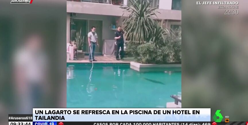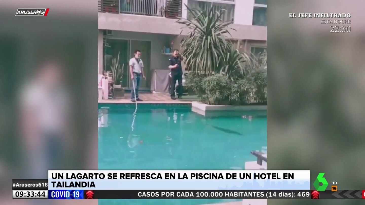 Los trabajadores y turistas de este hotel de Tailandia se han visto sorprendidos por un lagarto gigantesco que se ha colado en la piscina del complejo para echarse unos largos.