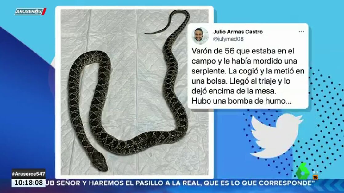 Este sanitario ha contado en redes sociales que un hombre de 56 años acudió al hospital tras sufrir una mordedura de serpiente en el campo y se presentó en la sala de triaje con el animal para que le dijeran si era o no venenoso. Al ver esto, todos los allí presentes "hicieron una bomba de humo", según ha explicado el médico.