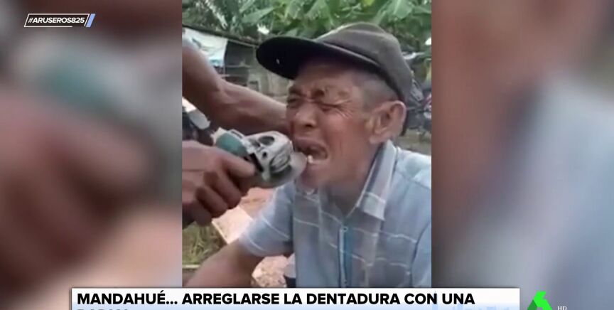 Como puede verse en el vídeo que acompaña a estas líneas, un hombre tenía problemas con su dentadura y decidió optar por una rudimentaria solución. Otro hombre, sierra radial en mano, lijó y cortó sus dientes con un irregular resultado.