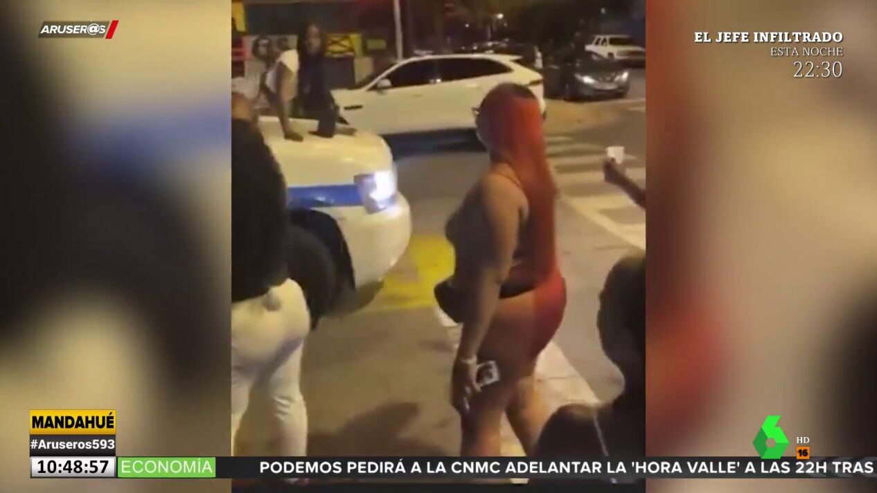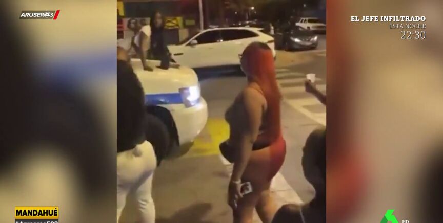 En el vídeo aparecen varias mujeres bailando sobre el coche patrulla mientras los policías continúan circulando sin detener su paso.