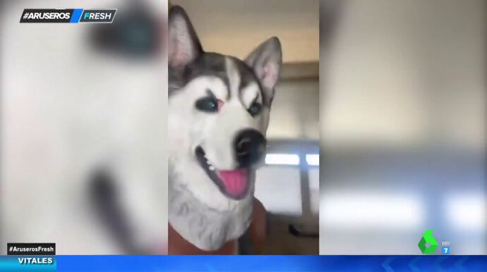 La reacción de un husky cuando ve a su dueño con una máscara de perro