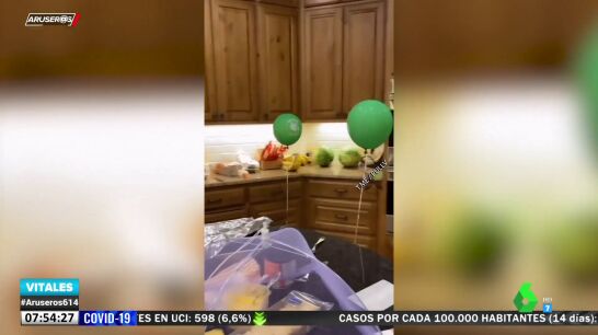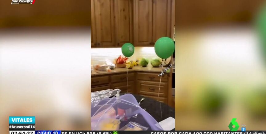 Hartos de andar por casa y tropezar con los animales, encontraron una solución: ahora van todo el día con un globo atado.