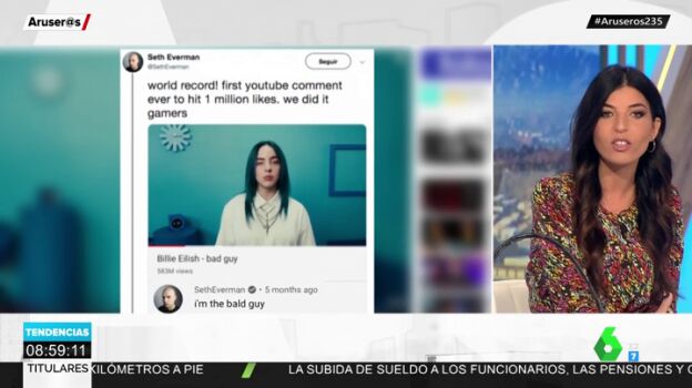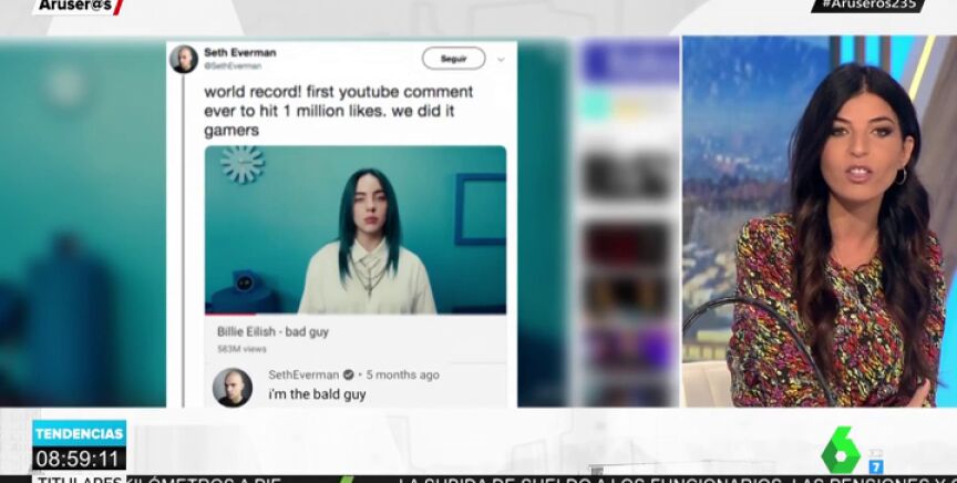 En esta ocasión ha sido un influencer el que ha conseguido el comentario del millón. Lo ha hecho comentando un vídeoclip de la cantante del momento, Billie Eillish. Se trata del tema Bad Guy (Mal tío) y el comentario reza "I'm the bald guy" (Soy el tío calvo) y efectivamente es lo que refleja su foto de perfil. Un irónico juego de palabras que logra superar el millón de 'me gustas' en YouTube.
