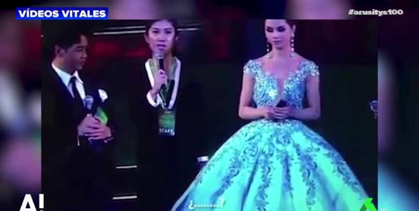 Sin embargo, la intérprete asiática tradujo el discurso al inglés trasladando un mensaje muy diferente: "Miss International Queen es muy...para todos en la habitación".