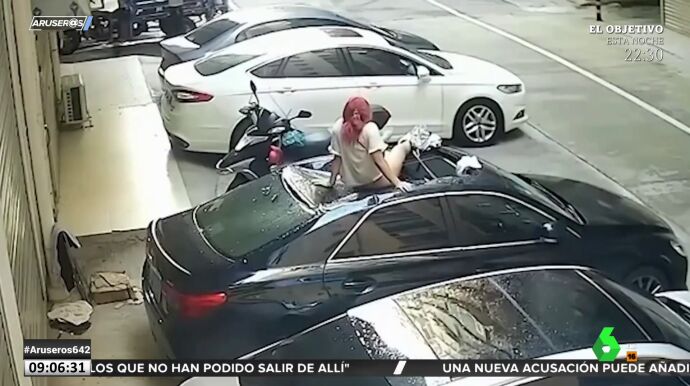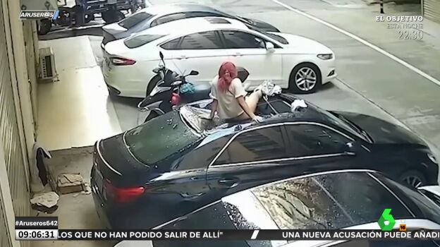"Este vídeo es uno de los 'arusoros' del día", explica Alfonso Arús. Una pareja practica relaciones sexuales en el balcón de su casa cuando de repente la mujer cae por la barandilla y acaba en ropa interior encima del techo de un coche: "Se ha dejado la espalda", cuenta Angie Cárdenas.