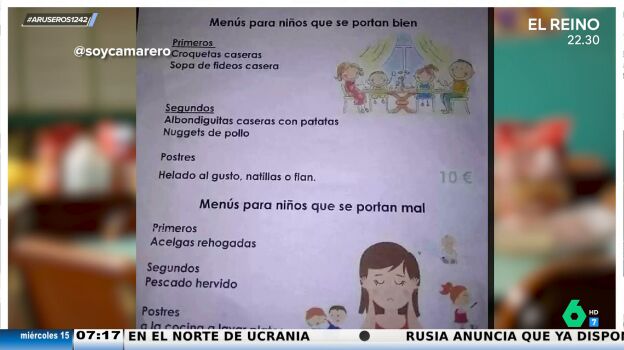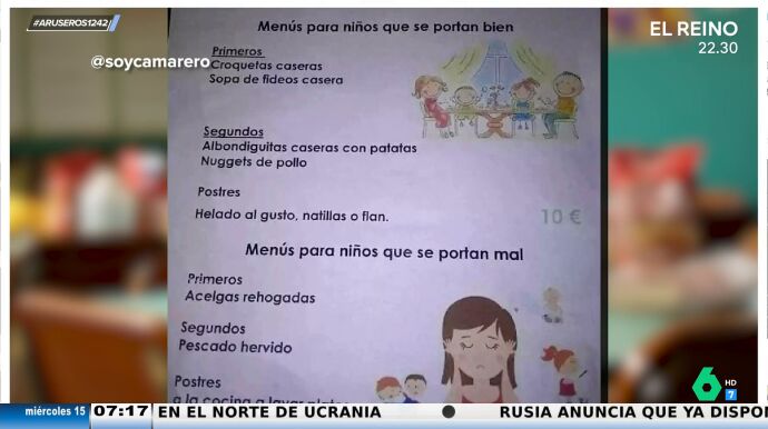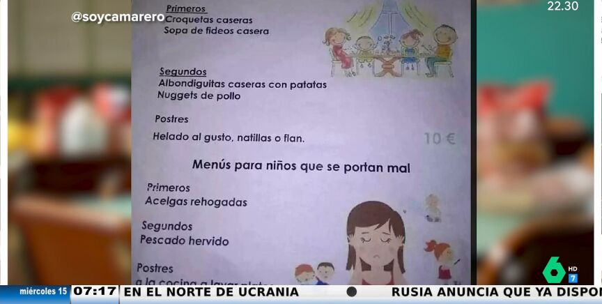 El menú infantil de este hotel está indignando a muchos padres, porque lo han dividido en niños que se portan bien y mal. La comida de los niños buenos está compuesta por un primer plato a elegir entre croquetas y sopa, de segundo albóndigas caseras o nuggets y de postre helado, natillas o flan. Mientras que los malos tienen acelgas de primero, pescado hervido de segundo y fregar los platos de postre. Los padres se quejan porque piensan asociar la verdura y el pescado a un castigo creará un rechazo en los niños.