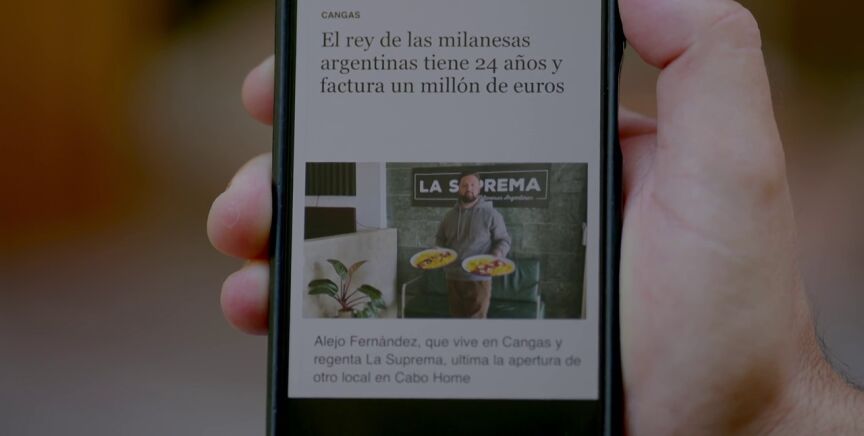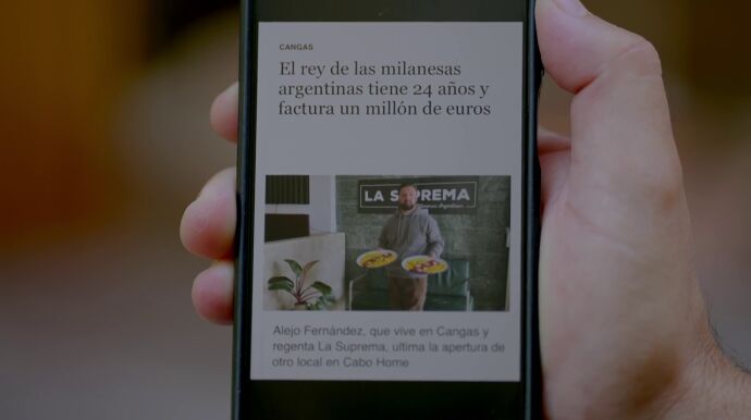 Juanjo, de La Posada - Brasería Lapamán, tiene además un bombazo que darles. "El hijo tiene un millón de euros de facturación", dice mientras enseña en su teléfono móvil una noticia. "El rey de las milanesas argentinas tiene 24 años y factura un millón de euros", lee el titular Alberto Chicote. "Ya cuando me tocan la honestidad...", se mosquea Juanjo.