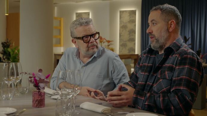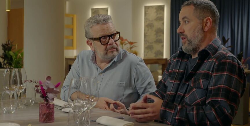 Alberto Chicote no da crédito del continuo pique entre los hosteleros del 'Aldara' y 'Azoka' durante la grabación de Batalla de restaurantes: Donosti. "Tu carta parece una novela de Cervantes, tronco", critica Rubén a Fernando.