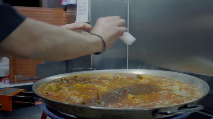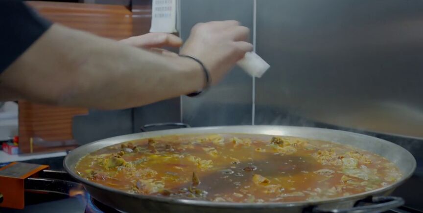 El primer restaurante en pasar por la prueba de fuego es el local de Salvador Parras, propietario y cocinero de 'La Nova Tauleta'. "Los caracoles y el azafrán son importantes", asegura el dueño antes de llevar su presentación a la mesa. Pero cuando el resto de comensales ven la paella, se quedan "helados".
