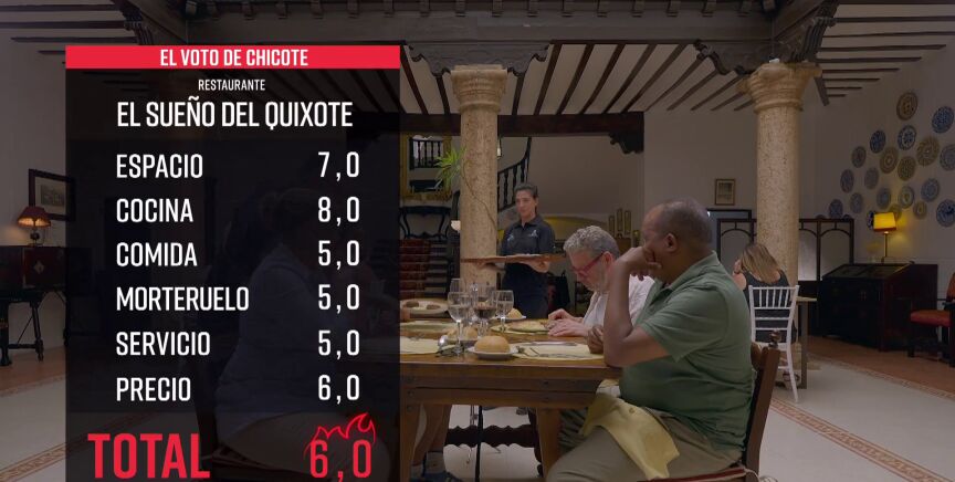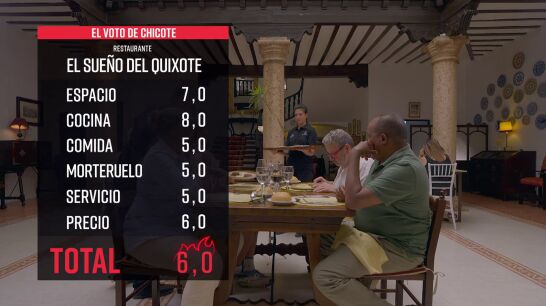 "Los Sueños del Quixote son los sueños de Agustín, un restaurante donde pretende plasmar toda una vida basada en diferentes cocinas y dedicada al oficio", explica Alberto Chicote, que destaca que aunque "el morteruelo no ha convencido, el resto de la comida ha estado mejor". Además, el exitoso chef destaca que "el espacio es único y se merece una propuesta que se salga de lo habitual y plasme de mejor manera eso con lo que sueña Agustín, dejar un legado culinario en San Clemente, su pueblo".