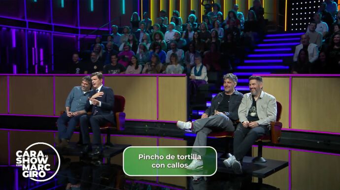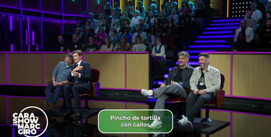 En Cara al Show, Marc Giró presenta el juego 'Operación tapas': una caótica prueba en la que el presentador, junto a Évole y Estopa, se enfrenta a adivinar tapas españolas interpretadas al canto por la soprano Begoña Alberdi.