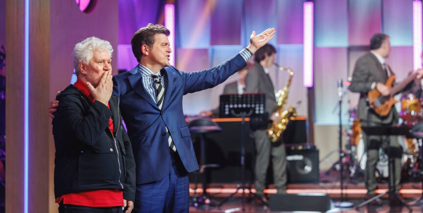 Almodóvar irrumpe en el plató de Cara al Show con Marc Giró, entre adelantos de su próxima película, el impacto de su cine en "salidas del armario", su "olé a la pluma" y sus anécdotas en el set.