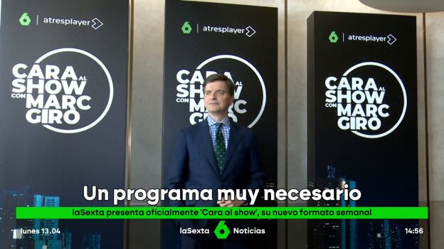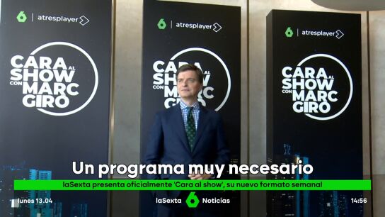 Ya queda menos para el esperado estreno de Marc Giró en laSexta. La cadena de Atresmedia ha presentado este lunes en Madrid 'Cara al Show', un nuevo programa de entrevistas en el que el aclamado presentador abordará la actualidad con su inconfundible tono crítico y desenfadado. El formato, que se emitirá de forma semanal, ultima los detalles para su estreno muy pronto en el Prime Time de laSexta.