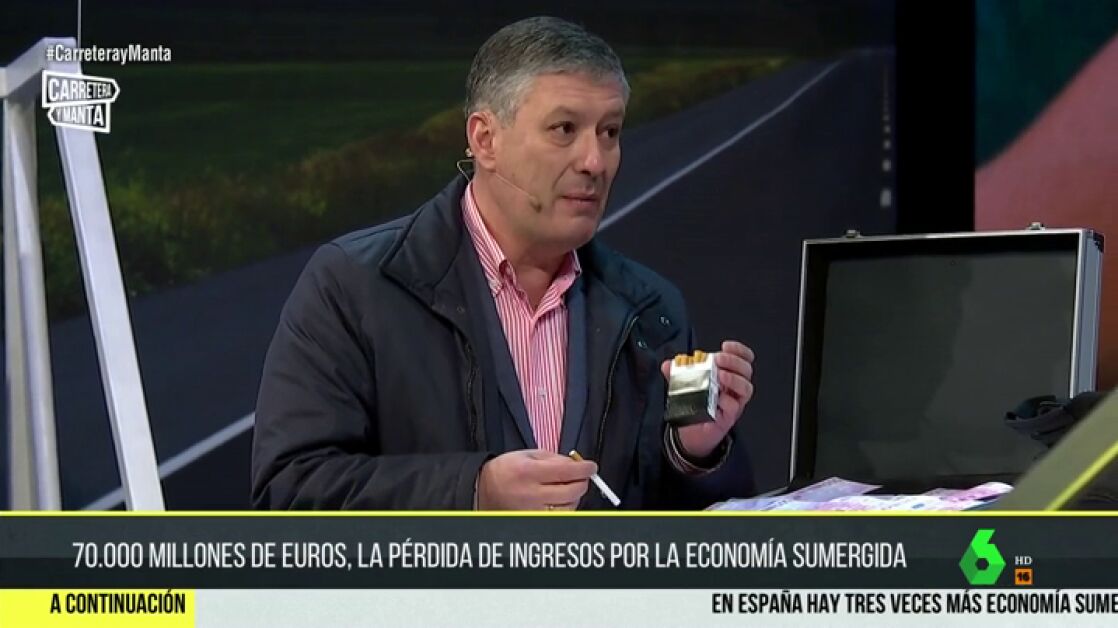 José María Benito, inspector de Policía, explica en Carretera y Manta cómo se consiguen mover grandes cantidades de dinero negro. Uno de los métodos más utilizados, y que más sorprende, es la cajetilla de tabaco. "Vacían el cigarro e introducen un billete de 500 euros en su interior. Si cada paquete tiene 20 cigarrillos, estamos hablando de 10.000 euros por cajetilla", apunta el inspector.