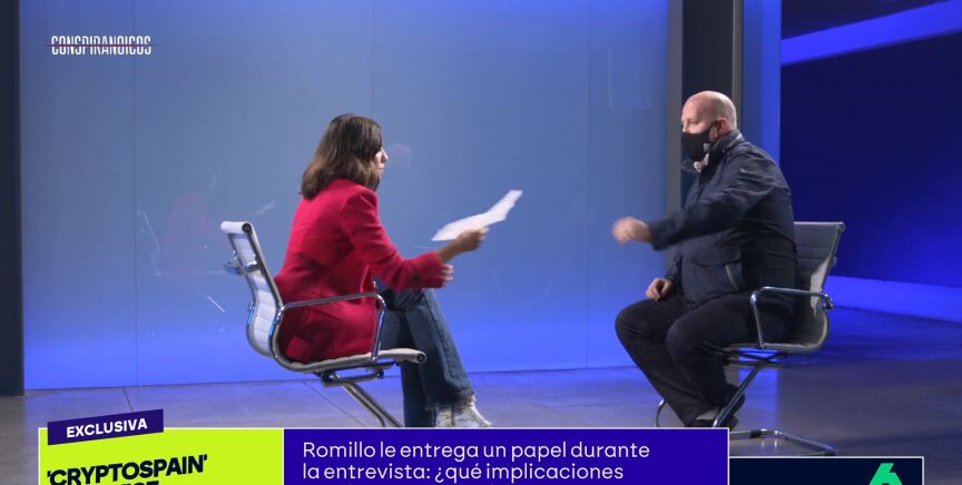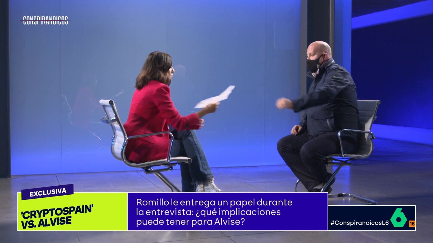 En su entrevista con Ana Pastor, Álvaro Romillo 'Cryptospain' muestra un documento que no tenia pensado enseñar: "Puede que mi abogado me monte un buen pollo por esto", reconoce antes de pedir que le den dos folios que, afirma, le envió "una persona muy allegada a Alvise Pérez".