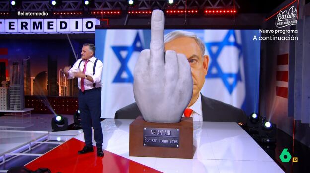 Además, El Intermedio también quiso hacerle otro regalo para honrar más la presencia de Netanyahu: una peineta gigante le hicieron su propia versión de 'El Cumpleaños Feliz'. "Es un homenaje a toda su carrera y a su figura política", explica el presentador antes de dar paso a todos los colaboradores del programa.