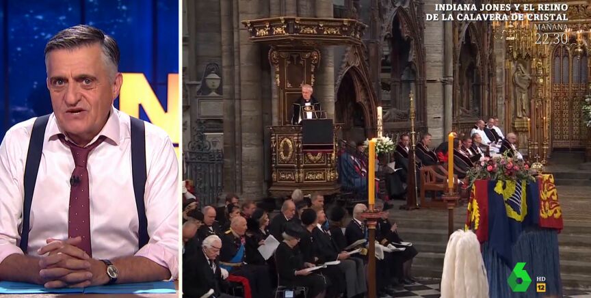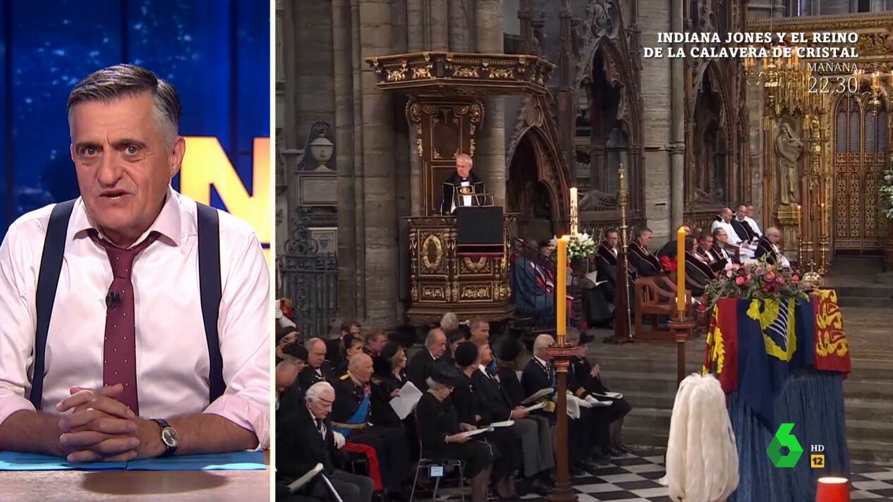 "Menos mal que la misa era anglicana y no católica, porque ya me imagina a la reina Letizia y al rey Juan Carlos dándose la paz", afirma El Gran Wyoming, que también celebra cómo el rey emérito compartía confidencias con la reina Sofía: "¡Madre mía, que de este funeral sale una boda!". Por otro lado, el presentador analiza la tensa relación entre Felipe VI y su padre: "El primero fue a cumplir con sus funciones de jefe de Estado y el segundo a cumplir su función como padre, avergonzar a su hijo". Puedes ver el divertido análisis de Wyoming sobre el reencuentro entre reyes españoles en el vídeo principal de esta noticia.