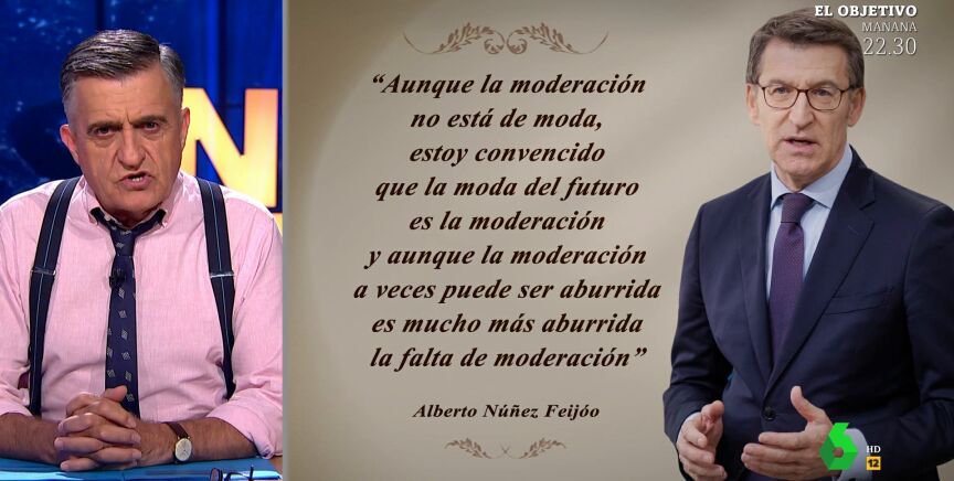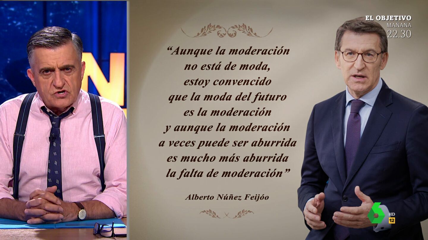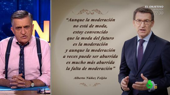 "Esta confusión me va a durar meses", espeta El Gran Wyoming tras escuchar las declaraciones del popular, y asegura que "la frase es digna de pasar a la historia como parte de las reflexiones celebres". Aunque hay algo que le inquieta: "Lo habéis pillado, ¿verdad? Es evidente lo que está ocurriendo. ¡Sal de ese cuerpo Mariano Rajoy!". Puedes ver la 'confusión' de Feijóo al hablar de que el PP es el emblema de la moderación en el vídeo principal de la noticia.