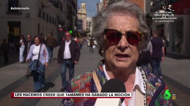 Imaginaos un mundo en el que la moción de censura hubiera tenido éxito y Ramón Tamames fuera el nuevo presidente. Pues El Intermedio no solo ha imaginado esta realidad alternativa, sino que la ha convertido en la broma del día en la calle. "¿Qué te parece lo que acaba de suceder en el Congreso?", le pregunta la reportera a una mujer, a lo que ella espeta: "Me parece de lo peor que nos puede pasar. De ser comunista a venderse a la ultraderecha. No lo entiendo".
