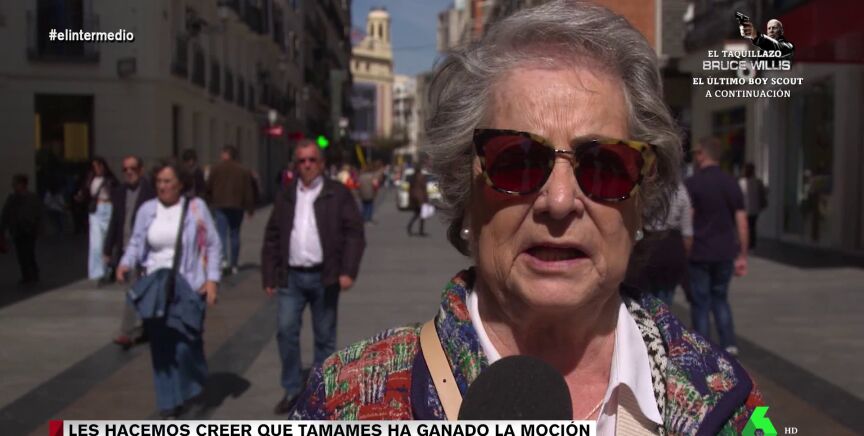 La misma opinión comparte otra de las entrevistadas, que "aguantará lo que tenga que aguantar", pero no acaba de comprender qué hará Tamames en el Gobierno si "no puede hacer nada": "Ha estado toda la vida metido en política y ha ido de chaquetero. Primero izquierda y ahora ultra derecha", critica su cambio de postura ante los micrófonos de El Intermedio, para terminar su discurso asegurando que todo lo que ha sucedido es "un chocho".