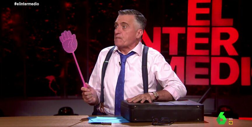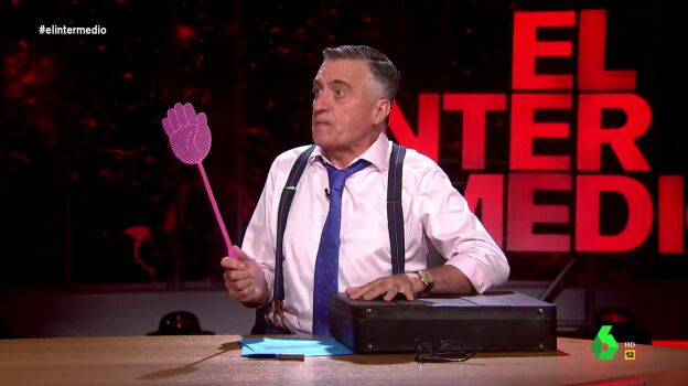 "Tenemos una brecha de seguridad", espeta para sorpresa de Sandra Sabatés, y activa el "protocolo de defensa que marca el CNI para este tipo de situaciones límite". Es en ese momento cuando el presentador saca una maleta negra de debajo de la mesa y de ella, un matamoscas, con el que la atiza hasta matar a la intrusa: "¡Hija de puta! Liquidada!". Vuelve a ver esta situación límite que se ha producido en el plató de El Intermedio a escasas horas de que comience la cumbre de la OTAN en Madrid.