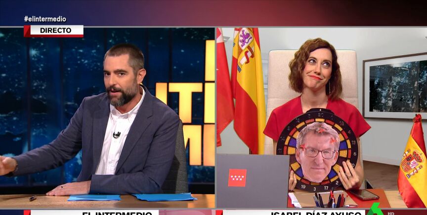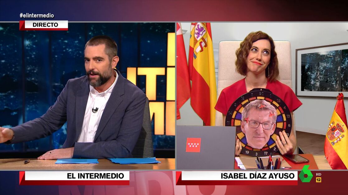 "¡Qué pena!, 'Perrito Sánchez' tiene que buscar un nuevo hogar", comenta 'Isabel Díaz Ayuso' en El Intermedio. La presidenta madrileña, imitada por Cristina Gallego, explica a Dani Mateo que debería gobernar la lista más votada y muestra la cara de Feijóo en una diana.