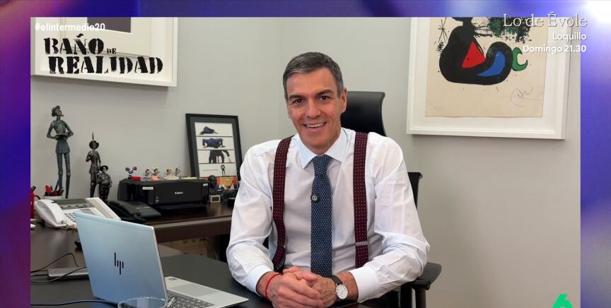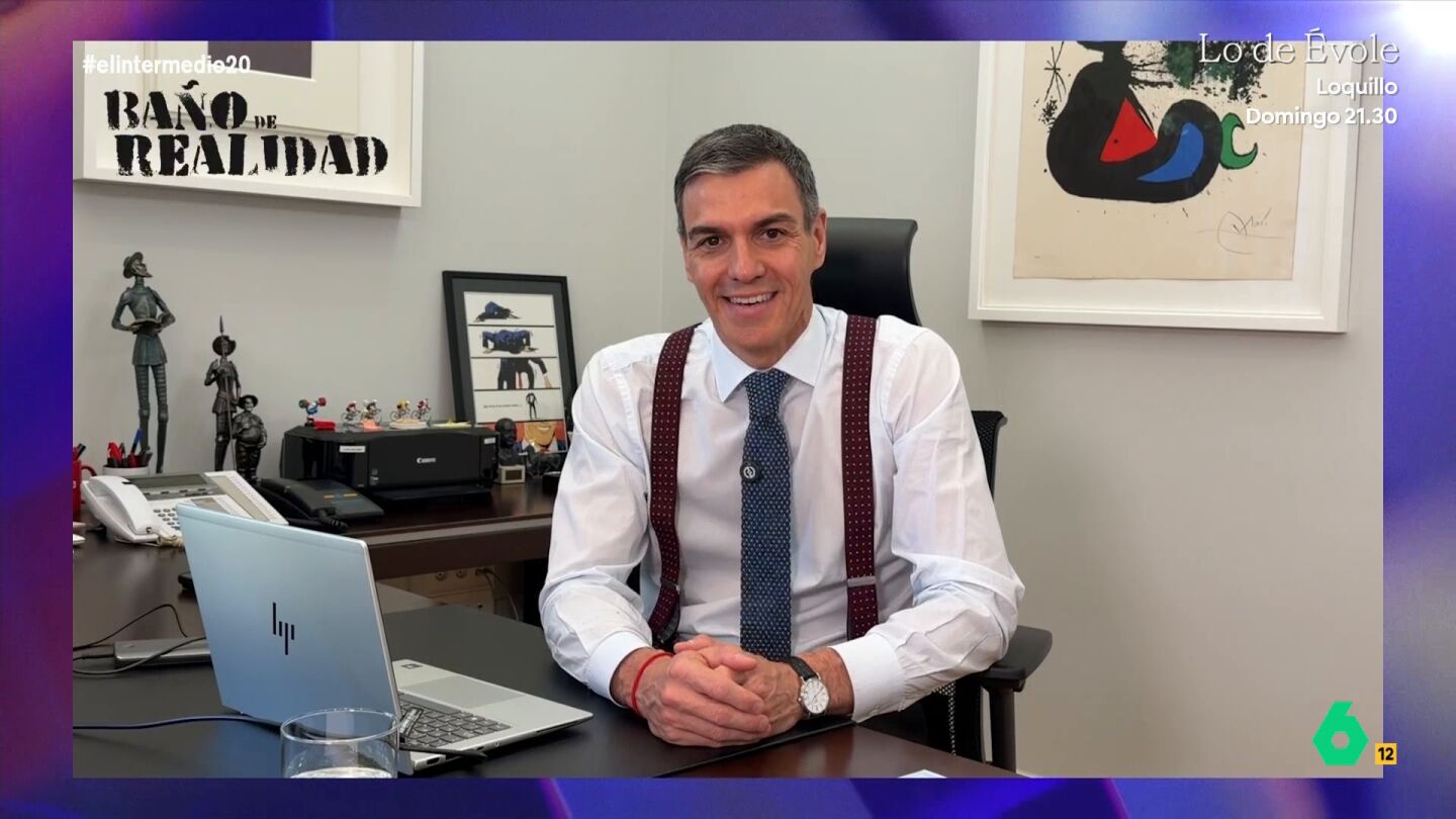 Pedro Sánchez también se apunta a la fiesta por el 20 aniversario de El Intermedio y manda un divertido 'baño de realidad' a Wyoming, además de copiarle el 'look' con tirantes.