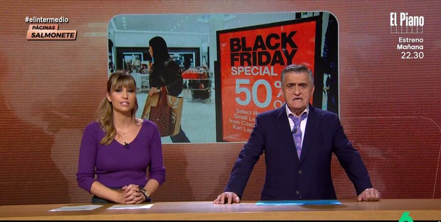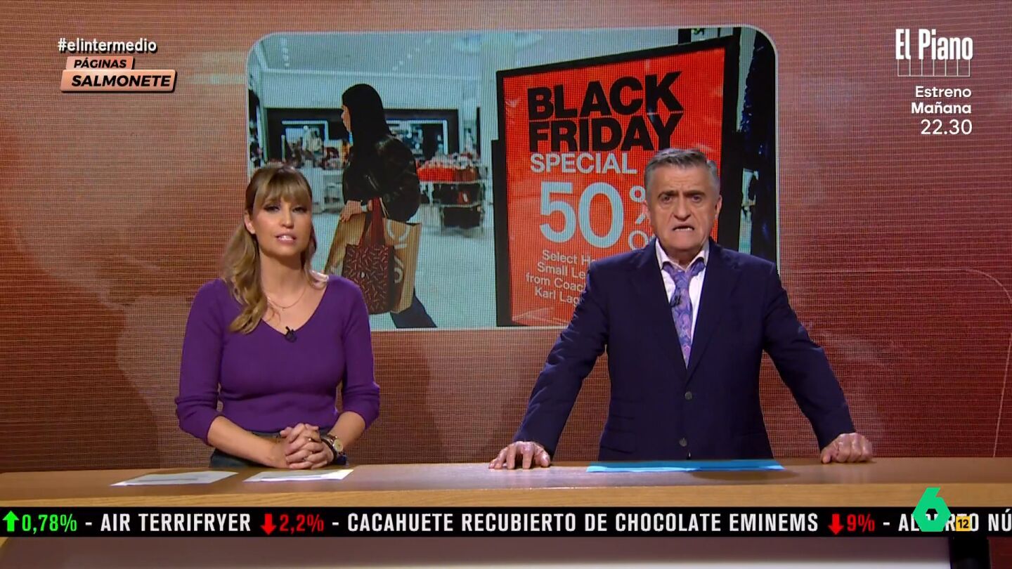 Hoy, en 'Páginas Salmonetes', el informativo económico de El Intermedio, Sandra Sabatés y El Gran Wyoming han analizado los últimos datos publicados por la Organización de Consumidores y Usuarios (OCU) sobre el Black Friday. "Los españoles desconfían de las ofertas", apunta Sandra Sabatés.