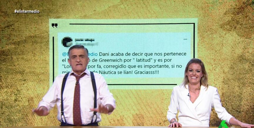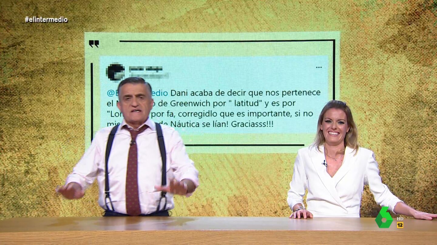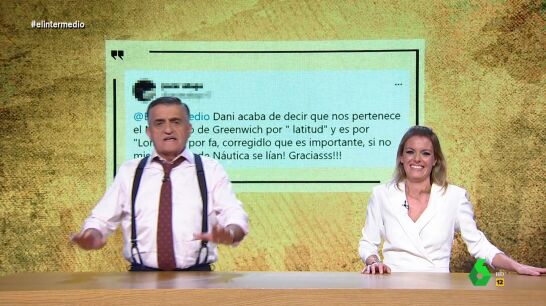 Un día más, Andrea Ropero cierra su reportaje con un 'baño de realidad' a Wyoming en el que comparte algunas correcciones de los espectadores a los errores de El Intermedio. En esta ocasión, un tuitero hacía saber al programa que Dani Mateo "acaba de decir que nos pertenece el Meridiano de Greenwich por "latitud" y es por "longitud". Por fa, corregidlo que es importante, si no mis alumnos de Náutica se lían", escribía en su tuit.