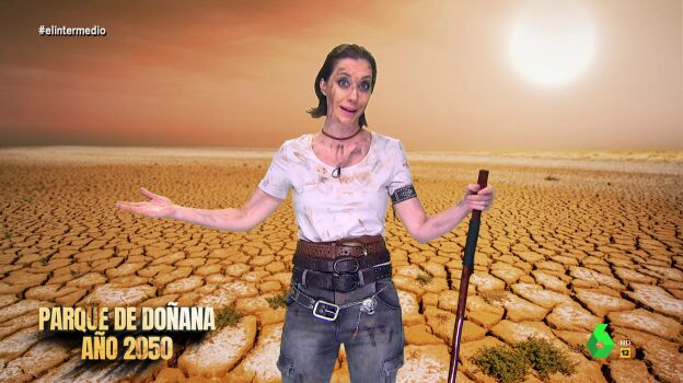 Cristina Gallego protagoniza este sketch desde el año 2050 para describir cómo será nuestro país de continuar esta situación de sequía por la que estamos atravesando. La colaboradora explica que el parque de Doñana es una zona "muy privilegiada" y que está prácticamente igual que en 2023, pues desde que se legalizaron los regadíos, "todo está mucho mejor, los únicos animales salvajes son los niños de una macrourbanización", destaca.