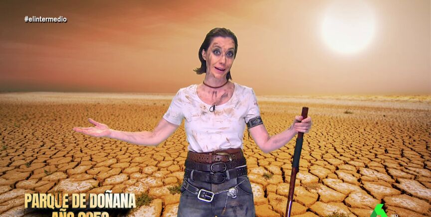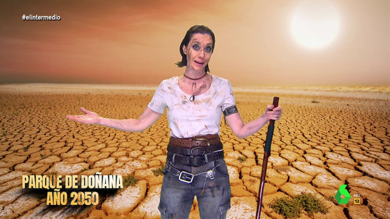 Cristina Gallego conecta, en este sketch, con El Intermedio desde el futuro para transmitir el estado del país tras años de falta de agua. "Desde que se legalizaron los regadíos todo está mucho mejor, los únicos animales salvajes son los niños", bromea.