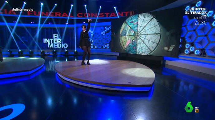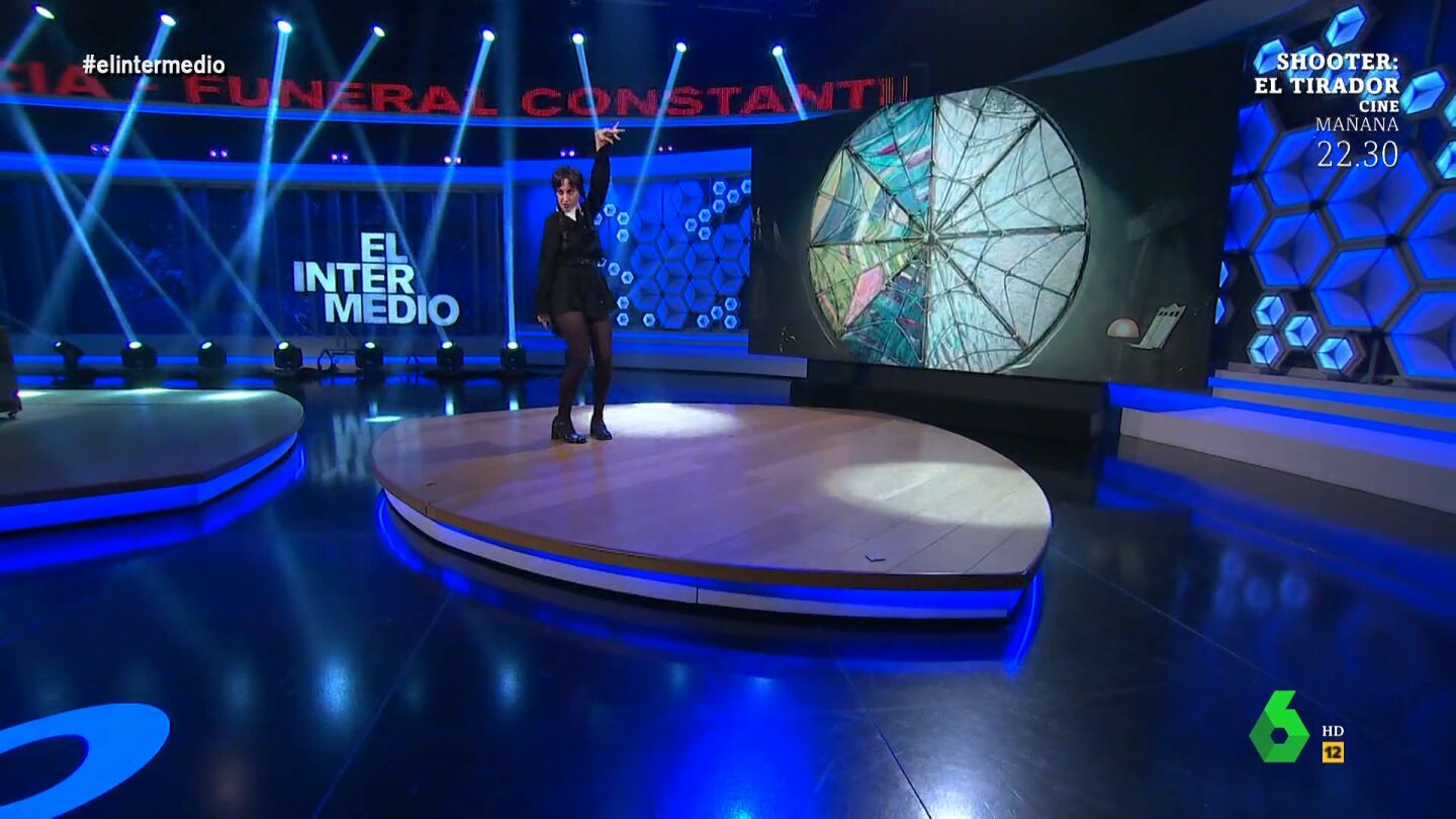 "Hola, soy Miércoles Gallego", destaca Cristina Gallego, que se convierte en el personaje de la serie de la familia Addams en el plató de El Intermedio para analizar todos los detalles del funeral de Constantino de Grecia, hermano de la reina Sofía.