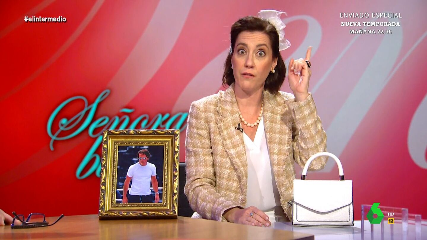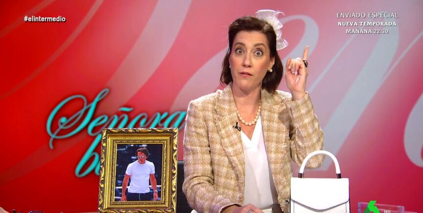 Cristina Gallego se convierte un día más en 'Piluchi', la 'Señora bien', e irrumpe en el plató de El Intermedio con un regalo para Sandra Sabatés: una foto de José María Aznar. "No la mires directamente, a ver si te vas a quedar embarazada", 'avisa' Wyoming a su compañera.