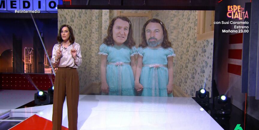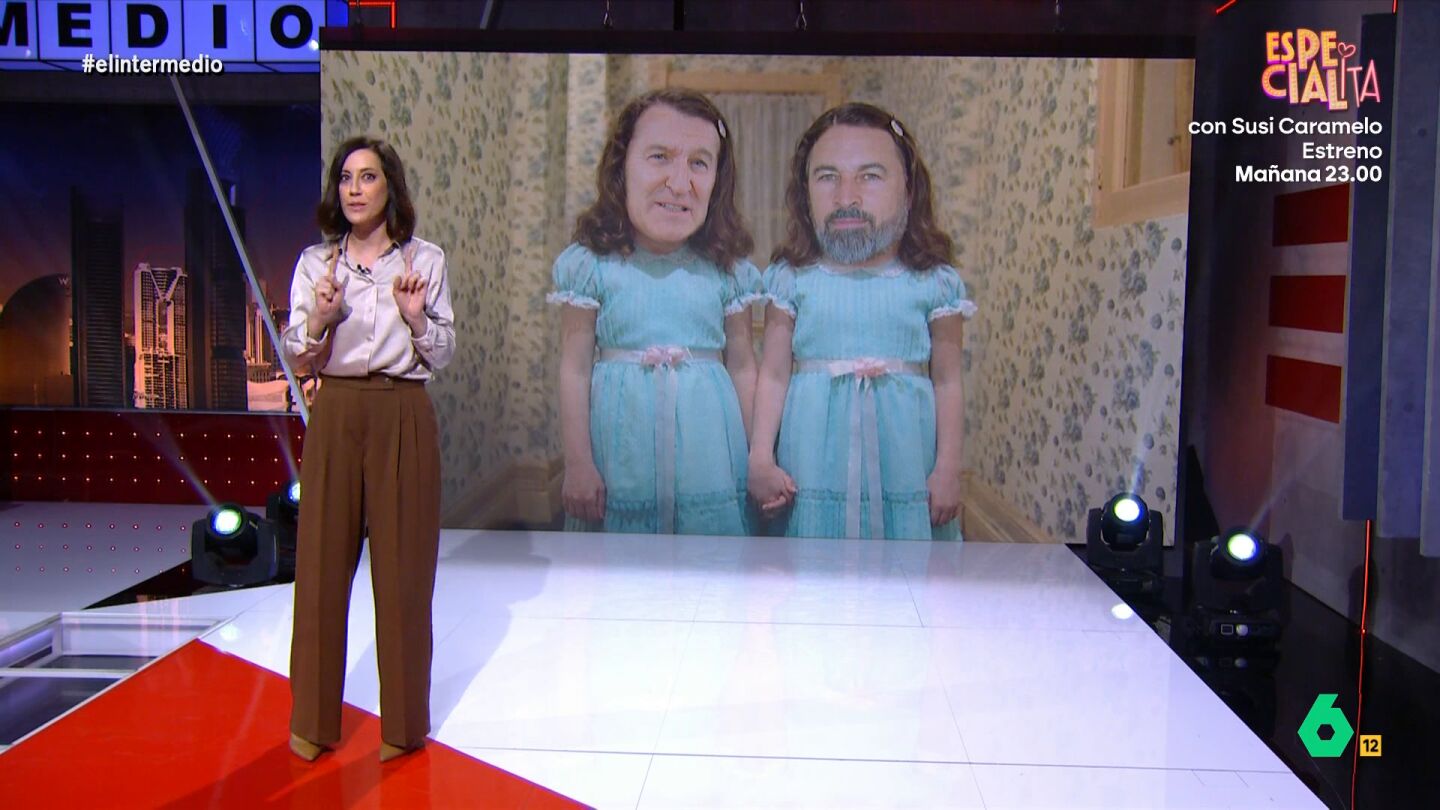 Feijoo era moderado, Abascal radical, pero ahora la colaboradora de El Intermedio señala que los dos "dicen cosas que dan tanto miedo que ya se les conoce como los gemelos de 'El resplandor'": "De hecho, también se te aparecen cuando vas montado en triciclo, pero porque están en contra de la movilidad sostenible", añade.