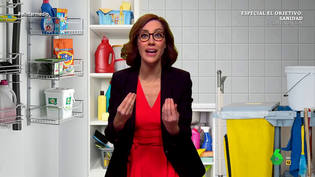 Las críticas de Belarra han generado un profundo malestar a los empresarios y también miedo, así que El Intermedio conecta con Cristina Gallego, directora general de un supermercado "cuyo nombre no revelaremos por seguridad", informa El Gran Wyoming. "Calle, que pueden escucharnos los escuadrones de la muerte de Podemos", espeta ella nada más comenzar la conexión, mientras se esconde en "el cuarto de las escobas del súper y lo estoy pasando mal".