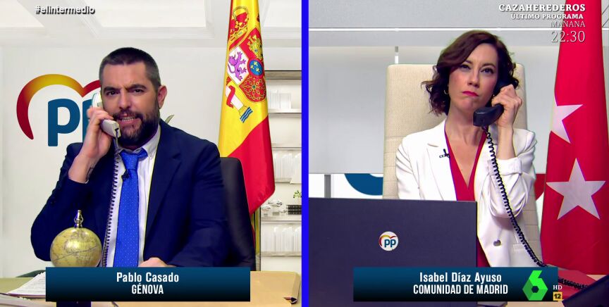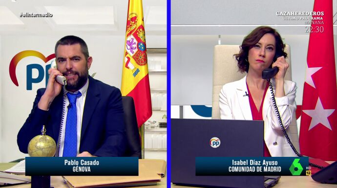 En el sketch que puedes ver al completo en el vídeo principal de esta noticia, Isabel Díaz Ayuso (interpretada por Cristina Gallego) y Pablo Casado (Dani Mateo) interpretan una conversación telefónica entre ambos políticos en la que el líder del PP le pide consejo a la presidenta de la Comunidad de Madrid. "Necesito que me hagas un favor", pide Casado a Ayuso, que alucina. "Me estoy quedando sin ideas para la campaña en Castilla y León, y como tú tienes mucha imaginación", afirma Casado, que destaca que las "encuestas no van bien": "No lo entiendo, me paso el día viendo granjas, me van a salir ruedas de tractor". Por eso, Ayuso le aconseja que busque algo nuevo "que haya atacado Garzón, pero que a la vez sea rompedor". Puedes descubrir los 'consejos' en el vídeo.