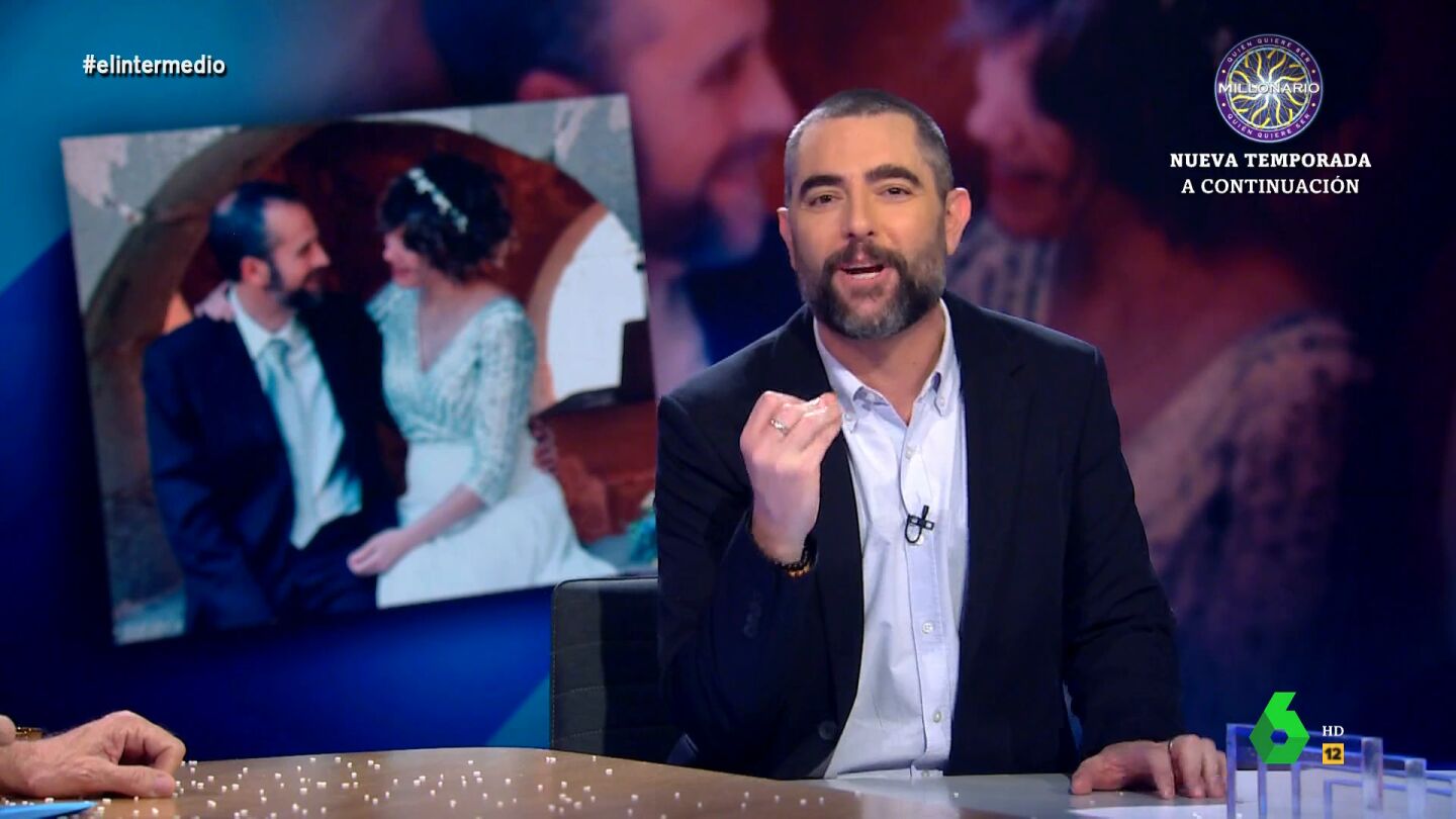Dani Mateo irrumpe en el plató de El Intermedio celebrando que el exobispo de Solsona, Xavier Novell, y la escritora de novelas erótico-satánicas, Silvia Caballol, se han casado por la iglesia. "Ya son marido y mujer ante los ojos de Dios y también ante los de Satán", comenta el colaborador.