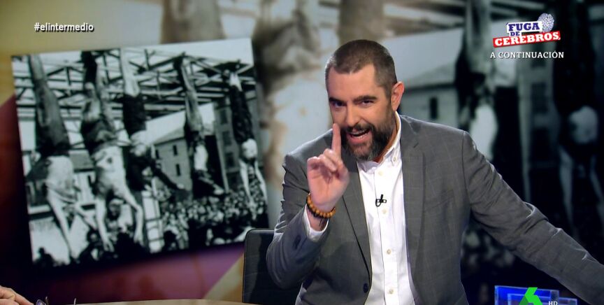 Dani Mateo destaca la última parte de la intervención de Abascal donde indica que "le produce repugnancia siempre que han colgado a alguien por los pies". Mateo, irónico, ha pedido que no se malinterpreten las palabras de Abascal, sobre todo la ultraderecha italiana, "no se vayan a pensar que está equiparando a Sánchez con Mussolini, por favor". "Uno es un dictador y el otro era italiano", añade.