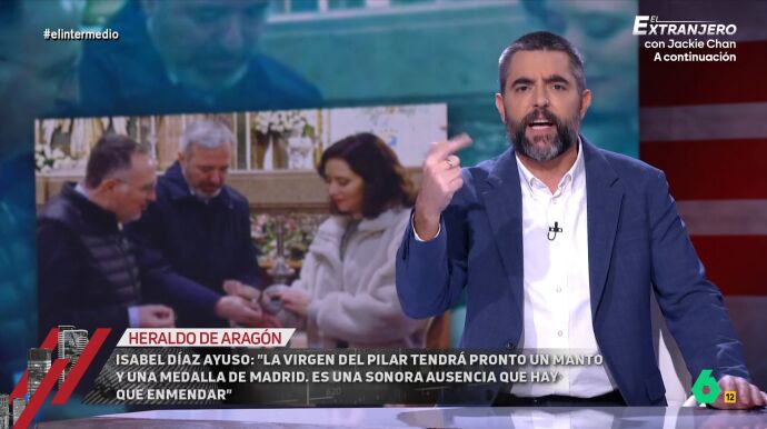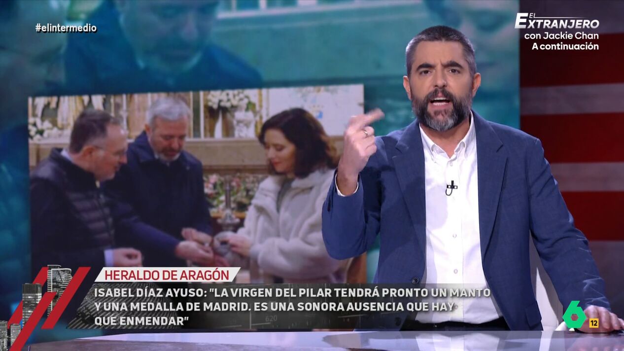 Dani Mateo bromea sobre la implicación de Ayuso en la campaña aragonesa, que hasta dice que la Virgen del Pilar recibirá pronto un manto y una medalla de Madrid: "Estaba la Virgen diciendo: 'ser madre de Dios está bien, pero querría tener algo de Ayuso'".
