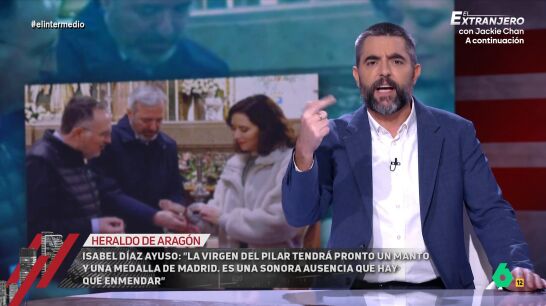 Dani Mateo ironiza sobre la presencia de Isabel Díaz Ayuso en la campaña aragonesa: "Ya se siente una maña más", asegura, "ya la llaman 'Isabelica'", ríe. "Siente tanto esta región que ha propuesto que la Virgen tenga un manto y una medalla de la Comunidad de Madrid, porque es una ausencia evidente que hay que enmendar", explica el colaborador.