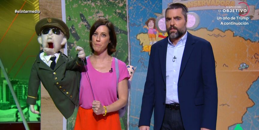 Algo que le parece "fatal" a Dani Mateo y, sorprendentemente, también a 'Dora', pues considera que "la Policía no debe enseñar estas cosas a los niños con carteles de VOX, sino con nuestro amigo Paquito Franco", para lo que utiliza una marioneta del dictador.