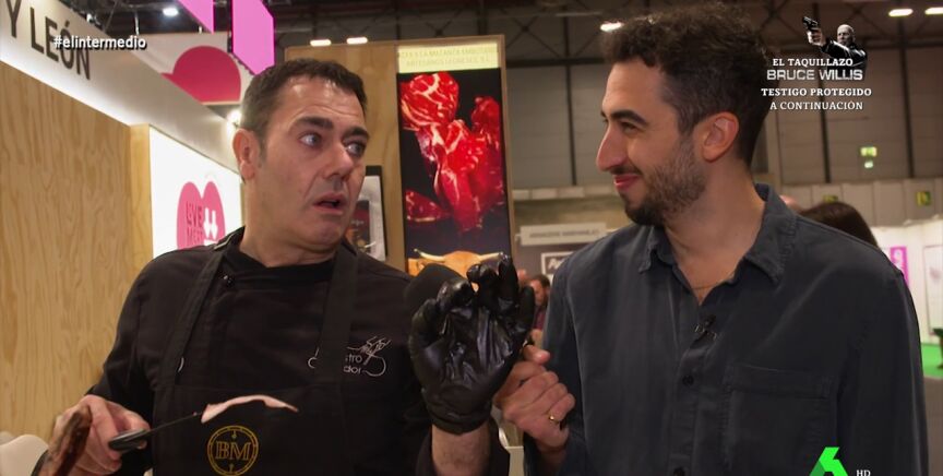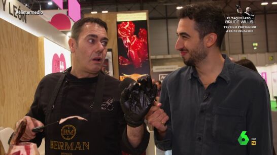 "Yo esta mesa la llevo a los restaurantes y corto delante del cliente y le digo '¿Quieres un plato de jamón?' y me dice 'soy vegano' y le digo 'ya, y yo fulano y el otro mengano'", bromea el experto jamonero. "¿No le haces la broma esa de '¿eres vegano? Pues yo soy más de invierno?", le responde el reportero de El Intermedio.