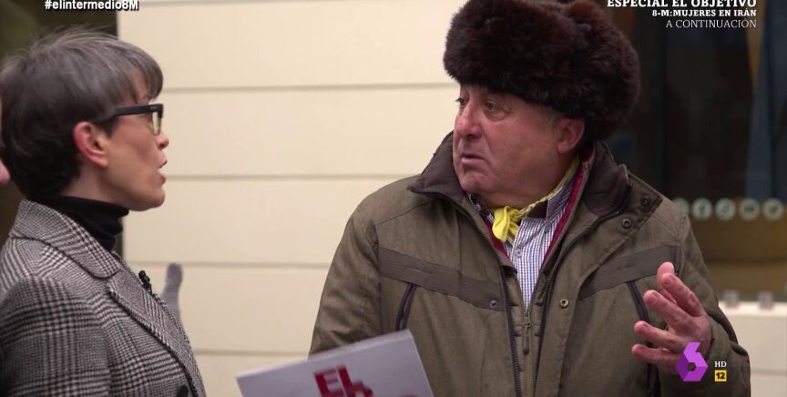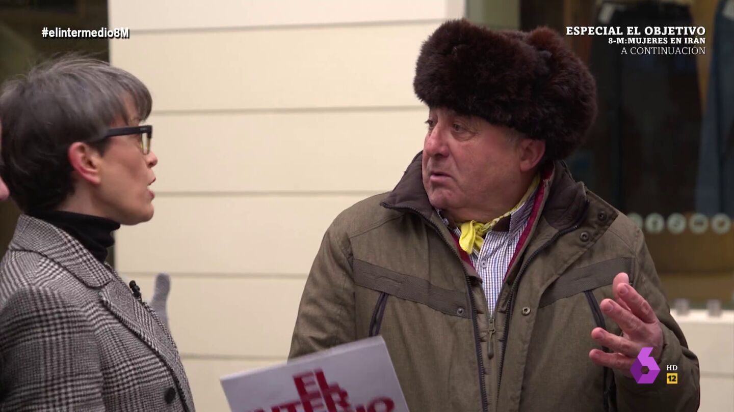 "Confundimos al feminismo con las mujeres, el feminismo es el sinónimo del machismo", afirma un señor, ante varias mujeres y Thais Villas, que responde indignada: "Que no, señor, que igual le pesa el gorro, que no es lo mismo".