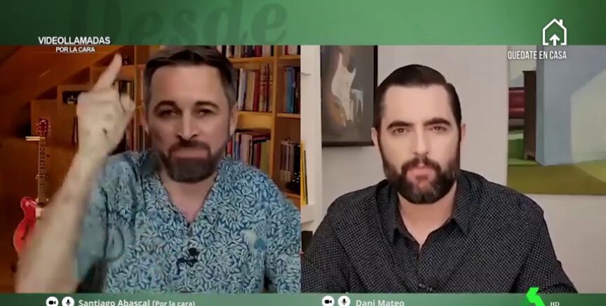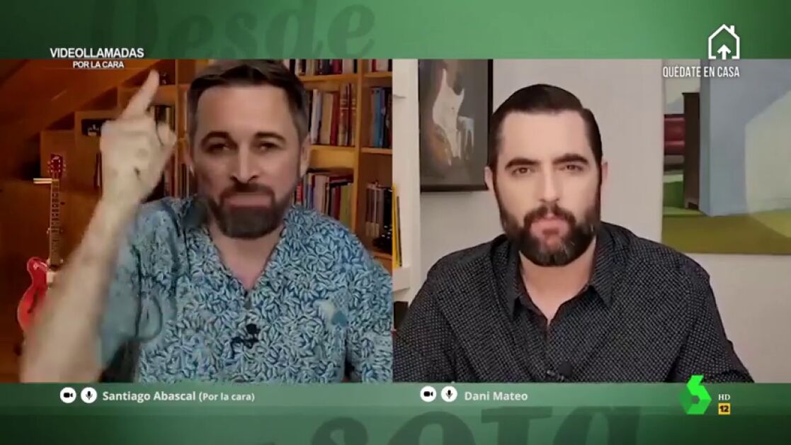 En una edición de 'videollamadas por la cara', Dani Mateo logró entrevistar al líder de Vox y "jinete de la ultraderecha", Santiago Abascal Conde, que arrancaba su primera aparición en El Intermedio reivindicado su orgullo patriota: "Buenas noches enemigos de la patria, ¡viva España!", arrancaba el político.