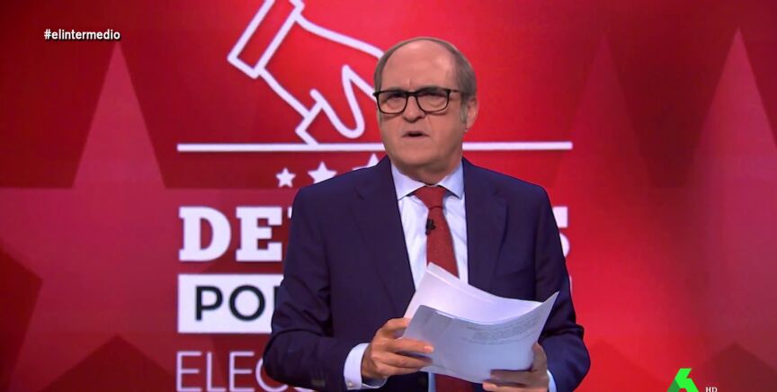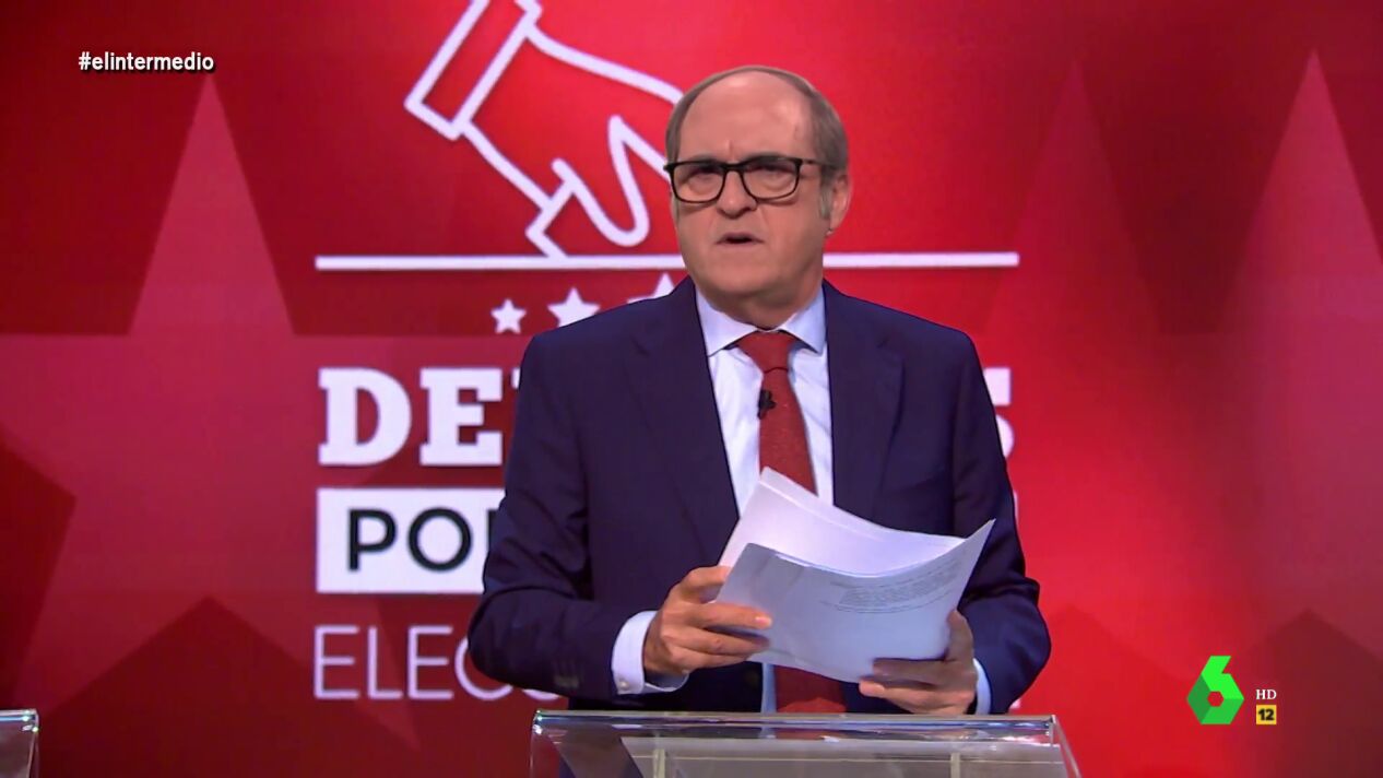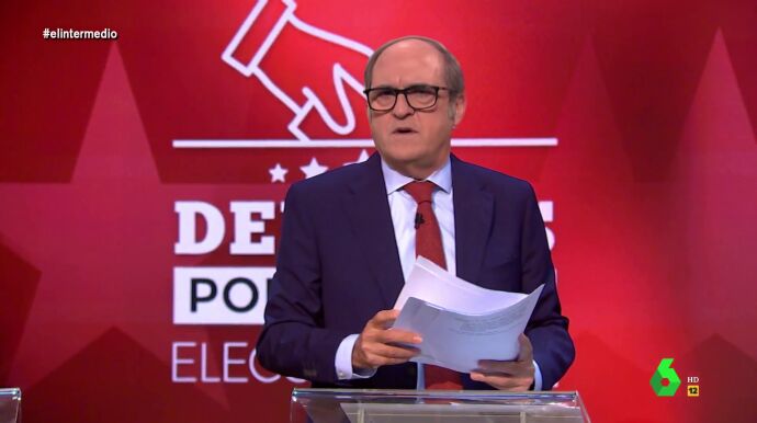 El candidato del PSOE(El Gran Wyoming) ha llegado justo cuando los otros dos participantes, Isabel Díaz Ayuso (Cristina Gallego) y Pablo Iglesias (Dani Mateo), habían terminado de confrontar posiciones. En el vídeo que acompaña estas líneas puedes ver la 'reacción' de Gabilondo yel monólogo que se marca él solo frente al atril.