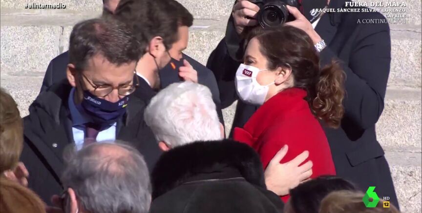"Finalmente no ocurrió porque El Intermedio lo evitó mandando a su mejor hombre", destaca Dani Mateo, que muestra en el plató cómo echó una mano David Pareja a Pablo Casado y a Isabel Díaz Ayuso con su reencuentro. "Venga, chicos, un poco de amor, que hay que acabar con los rumores", recomienda en el vídeo Pareja. Tras verlo, Dani Mateo lo tiene claro: "Un encuentro frío en el que no hubo manera de recuperar la llama. Pobre David Pareja, lo ignoraron tanto que entró en el acto como fotógrafo y salió sintiéndose diputado de Ciudadanos".