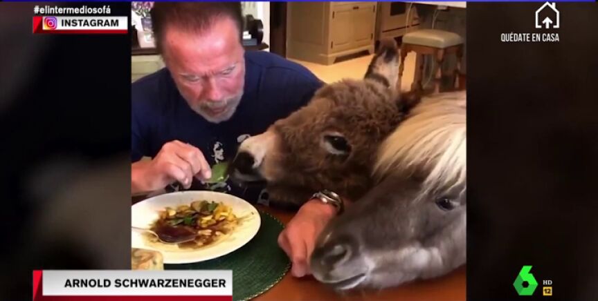 El confinamiento por la pandemia de coronavirus está sacando el lado más ingenioso (y más loco) de todos nuestros famosos. Es el caso de Arnold Schwarzenneger, que ha difundido un vídeo comiendo junto a un burro y un poni dentro de su casa.