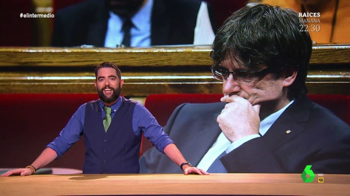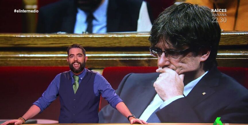 Dani Mateo revela en El Intermedio que Carles Puigdemont no pudo viajar a Quebec para dar una charla sobre el referéndum de independencia catalana porque se equivocó en un trámite: "Pagó 100 dólares por una gestión que en realidad cuesta siete".
