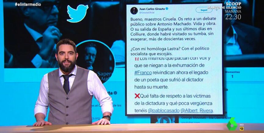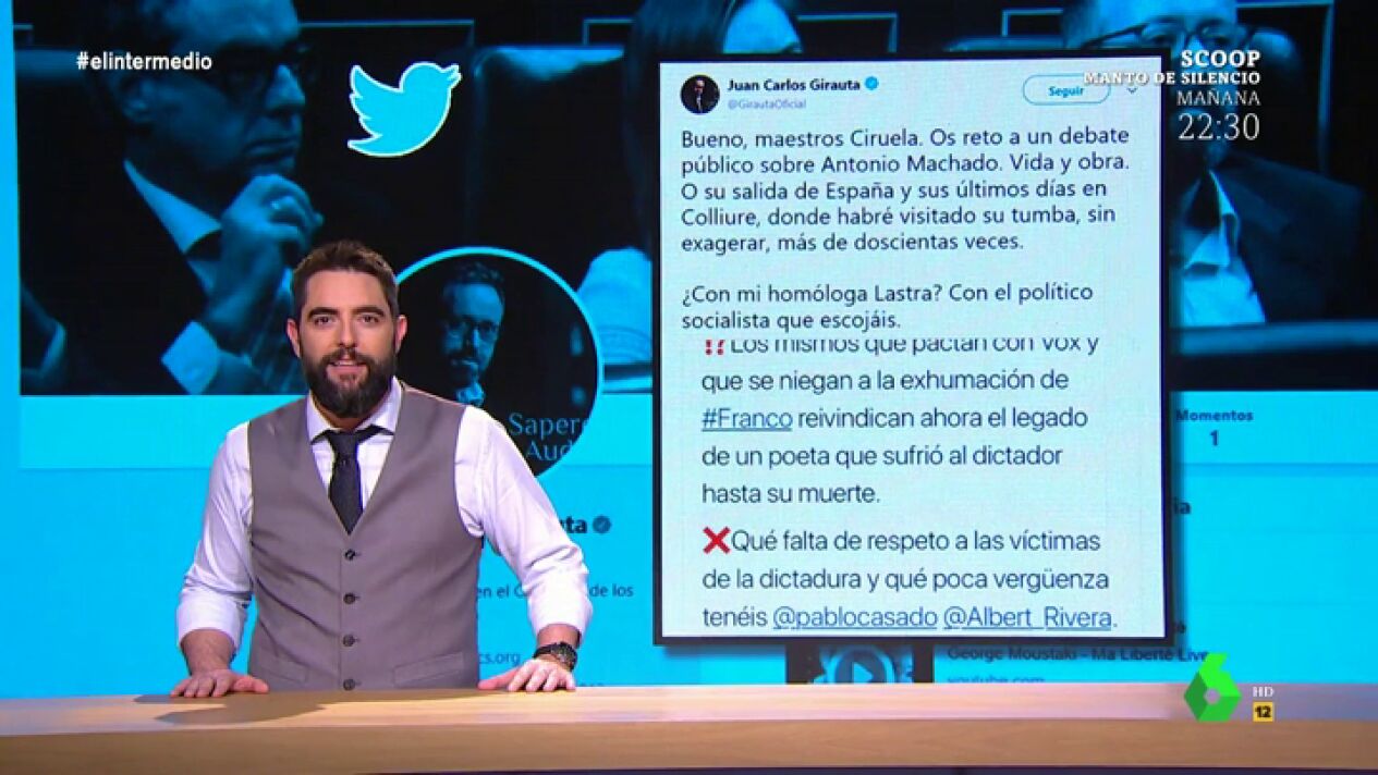 Pero "el favorito" de Dani Mateo es Juan Carlos Girauta. Después de que en Twitter el PSOE afease a Ciudadanos pactar con Vox, al mismo tiempo que honrabaun exiliado de la Guerra Civil, Girauta retaba a "un debate público de Antonio Machado", y aseguraba que, "sin exagerar", ha visitado más de 200 veces su tumba en Colliure.